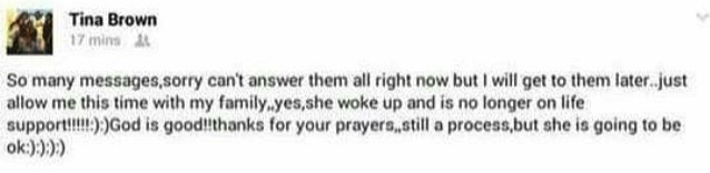 However Bobby Brown’s sister Tina Brown confirmed the news on her private Facebook page.