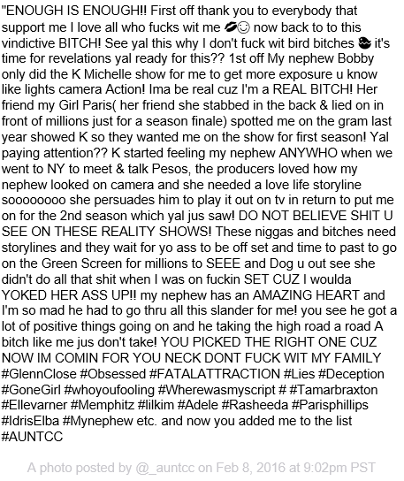 K.Michelle might of wrote a check that cant be cashed cause Bobby’s Aunt CC is giving us the real scoop from the hook up, to how she got hooked up and was able to be on the show.