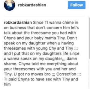 Gollllly! I guess everybody just getting free press today. Because people want to see what’s going on in real time, so of course they’re back and forth on all the Kardashians & Blac Chyna people pages. Reading subliminal and direct shots flung back and forth online. Whelp in this case T.I caught a bad case of the clap back via the disgruntled Rob Kardashian, and Tiny got hit in the cross fire.